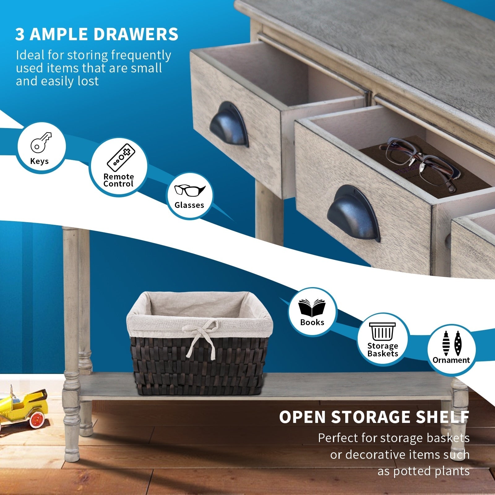 Accueillez vos invités avec style grâce à la console 3 tiroirs en bois Burlington. Dotée d'une structure en bois aux pieds finement sculptés, elle est dotée de trois tiroirs et d'une étagère inférieure ouverte offrant un vaste espace de rangement et d'exposition. Choisissez parmi six finitions polyvalentes pour une harmonie parfaite avec votre décoration.