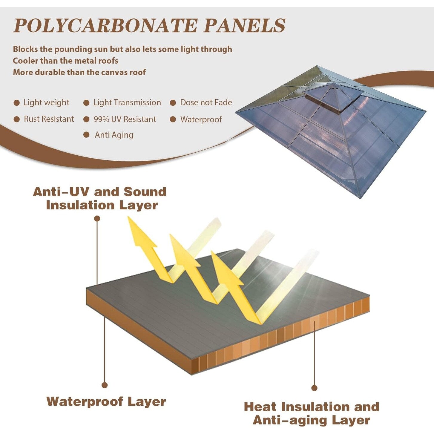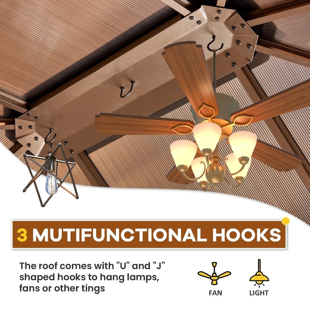 Ce gazebo présente un design raffiné à double toit avec des espaces de ventilation optimisés, favorisant une meilleure circulation de l'air pour un environnement plus frais et plus confortable. Les aérations latérales intégrées et dissimulées s'harmonisent avec la conception du toit pour aspirer activement l'air frais tout en facilitant l'évacuation de l'air chaud, créant ainsi une convection naturelle même lors des pics de chaleur estivale. Ce système intelligent de gestion de la circulation de l'air assure une protection solaire complète tout en maintenant une circulation d'air rafraîchissante, offrant ainsi une combinaison idéale d'ombre et de brise, comparable au confort d'une canopée naturelle.