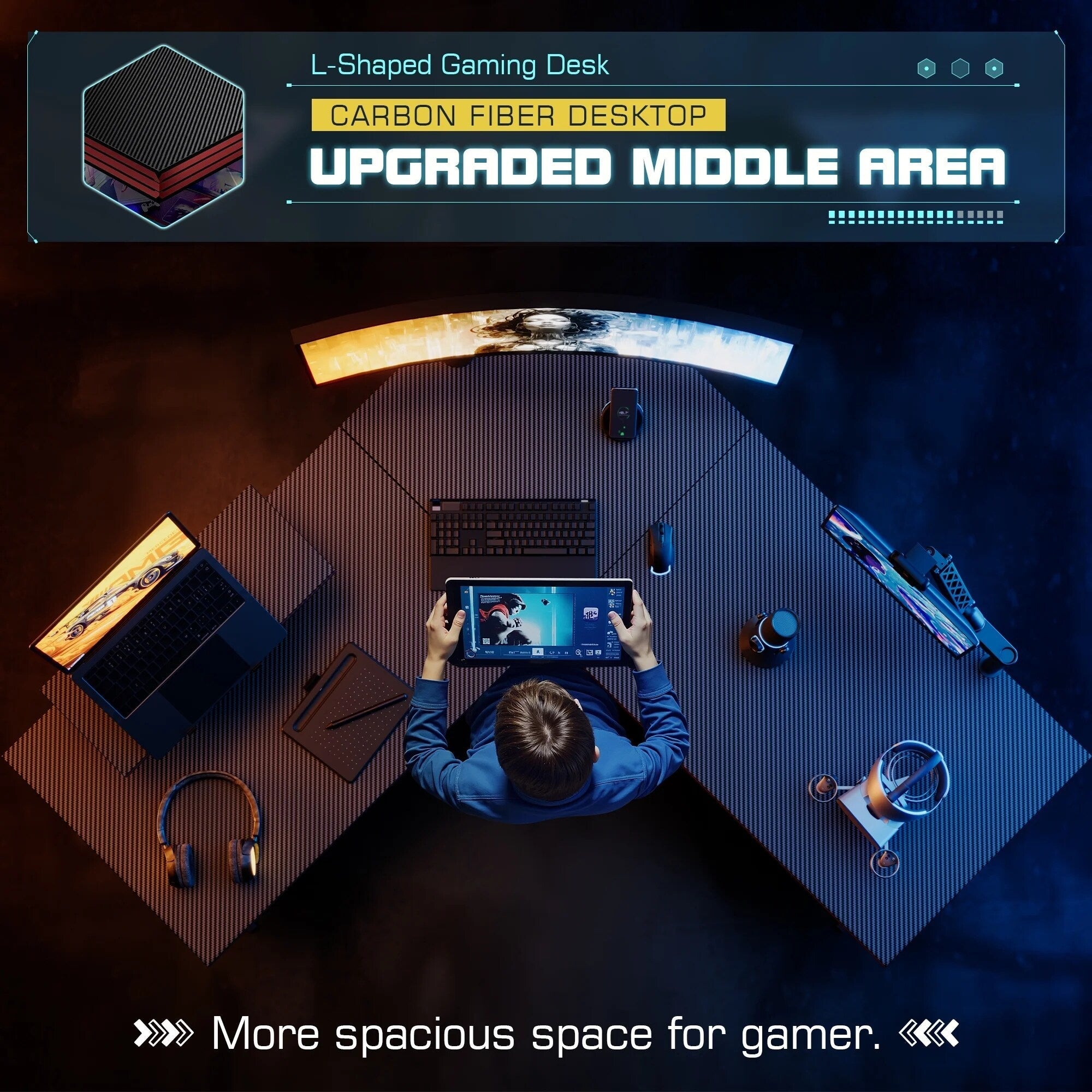 - Efficient Design: The L-shaped layout optimizes corner space, freeing up the central area of the room for a wider activity zone and providing ample storage options. The dual desktops facilitate seamless transitions during work or gaming sessions.