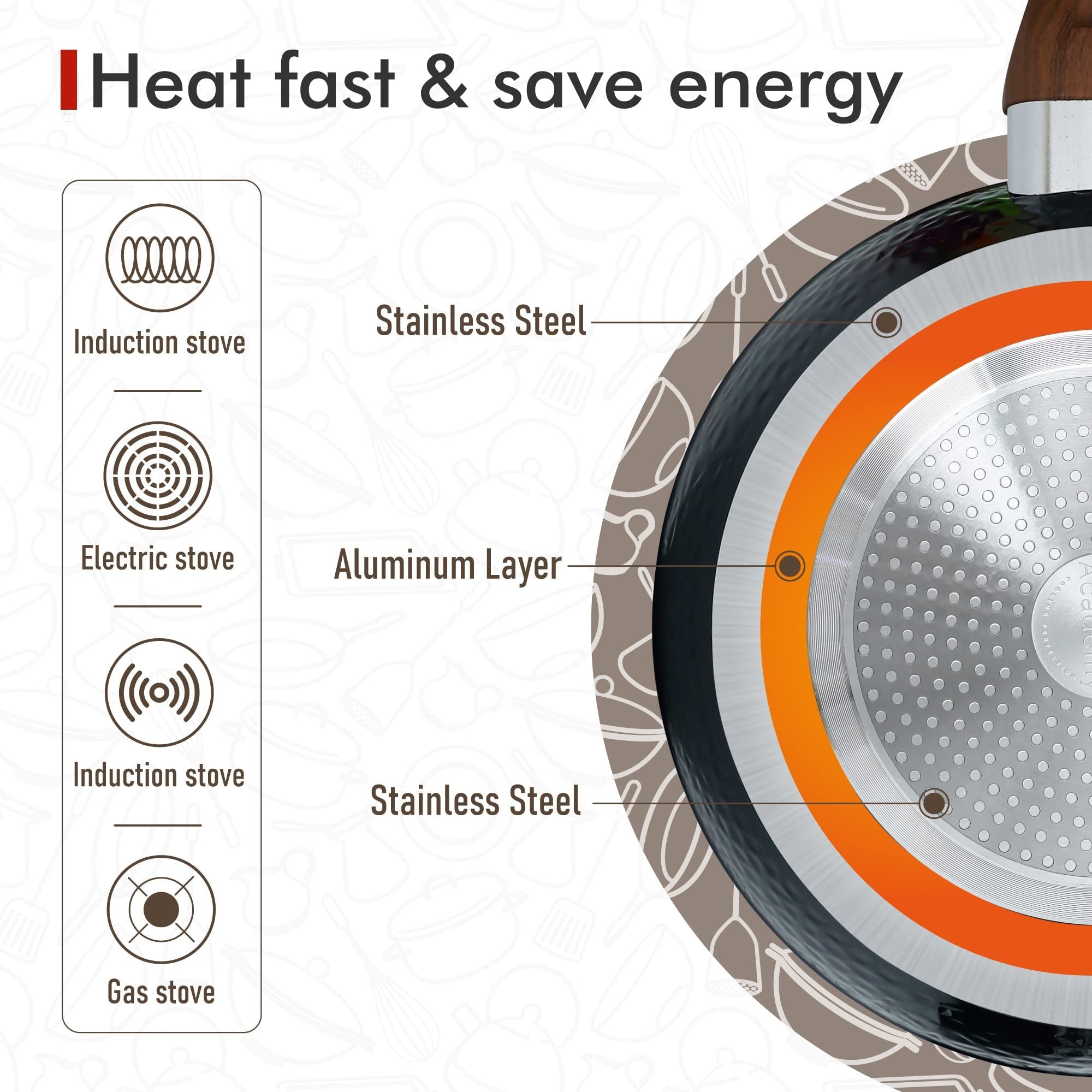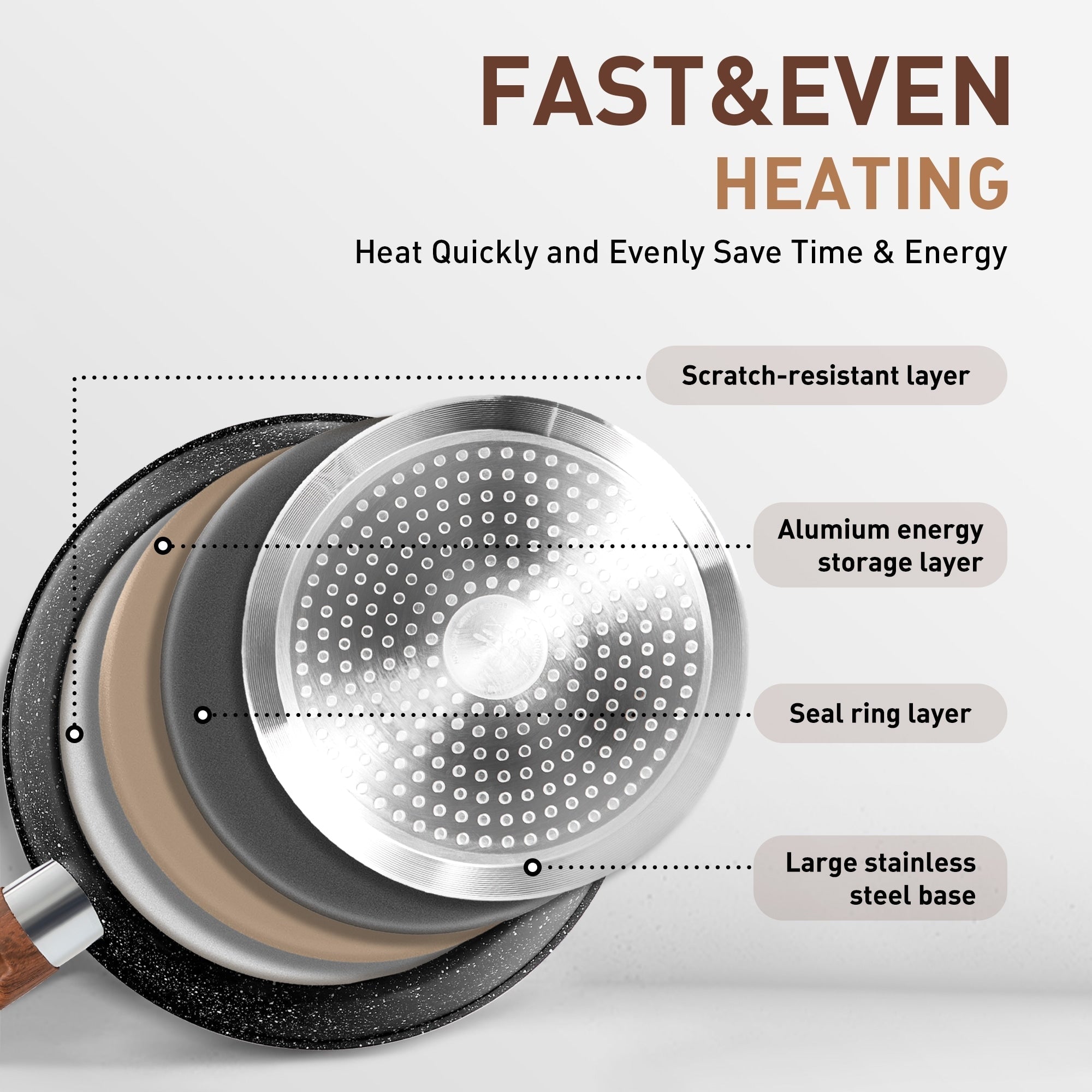 Préparez des plats savoureux avec notre batterie de cuisine antiadhésive avec revêtement en granit. Chaque pièce est dotée d'un fond en aluminium forgé pour une cuisson uniforme sur tous les feux, y compris l'induction. L'extérieur en granit alimentaire triple couche offre une durabilité et une résistance exceptionnelles à la déformation, tandis que l'intérieur recouvert de marbre naturel facilite la cuisson et le nettoyage. Les poignées en bakélite aspect bois apportent une touche d'élégance à cet ensemble polyvalent.