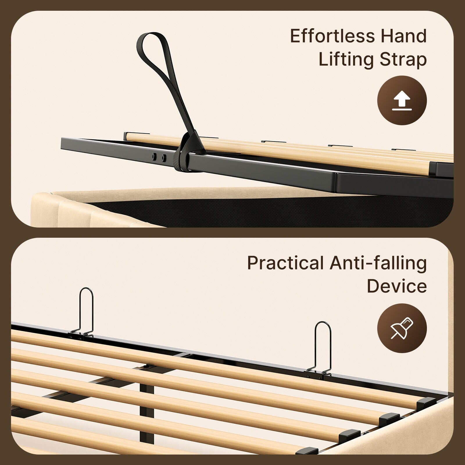 - Rangement maximisé : Le mécanisme de levage offre un grand espace de rangement pour la literie, les vêtements, les chaussures ou tout autre article que vous souhaitez garder hors de vue, contribuant ainsi à désencombrer votre chambre.