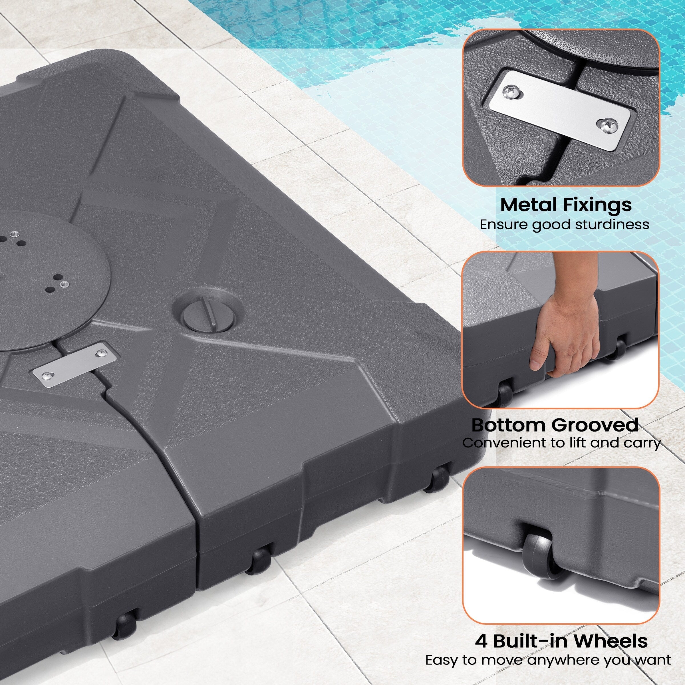 - Inclus 1 base de parasol carrée avec 4 roues