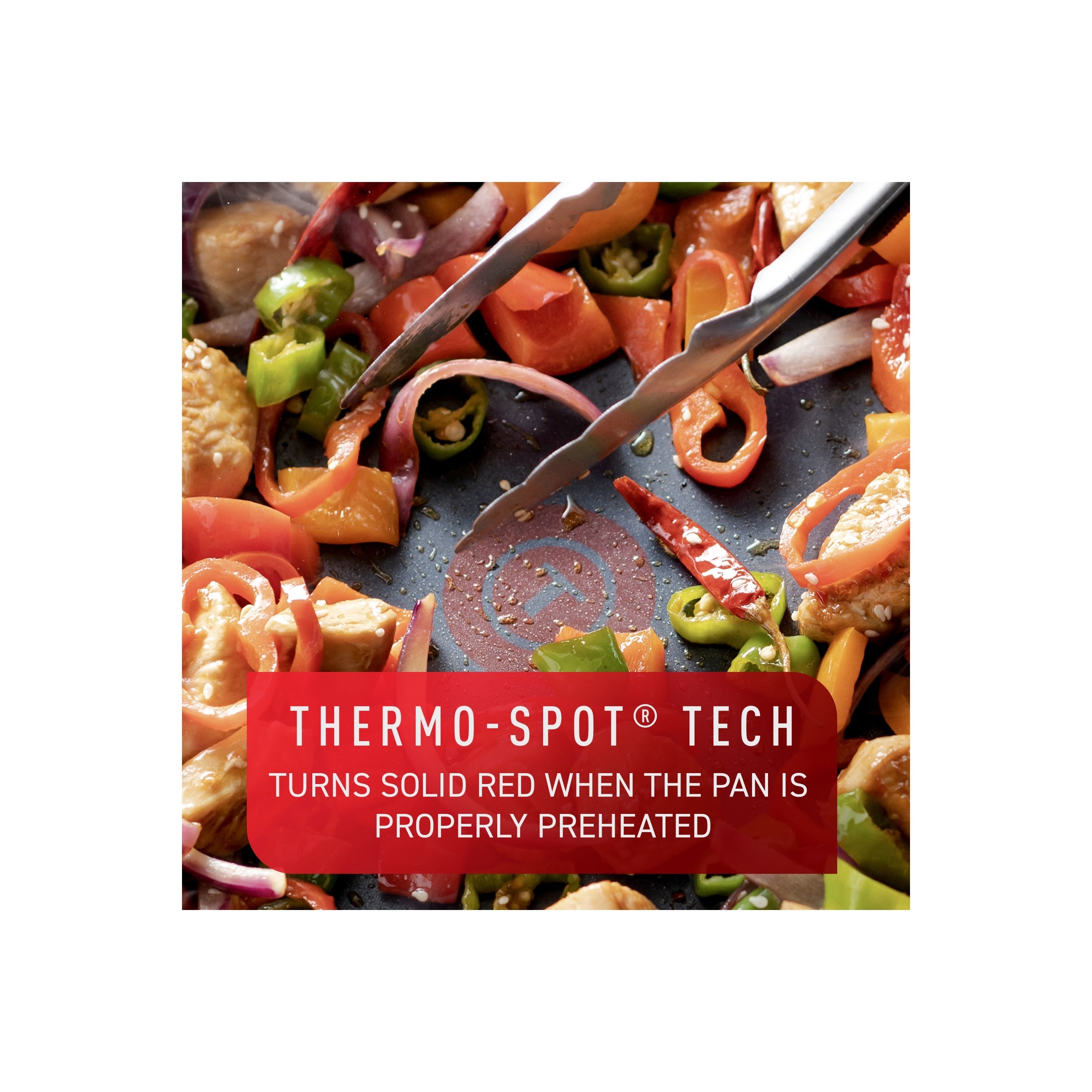 - Le Thermo-Spot devient rouge fixe pour indiquer que la poêle est correctement préchauffée (uniquement sur les poêles à frire et les sauteuses)